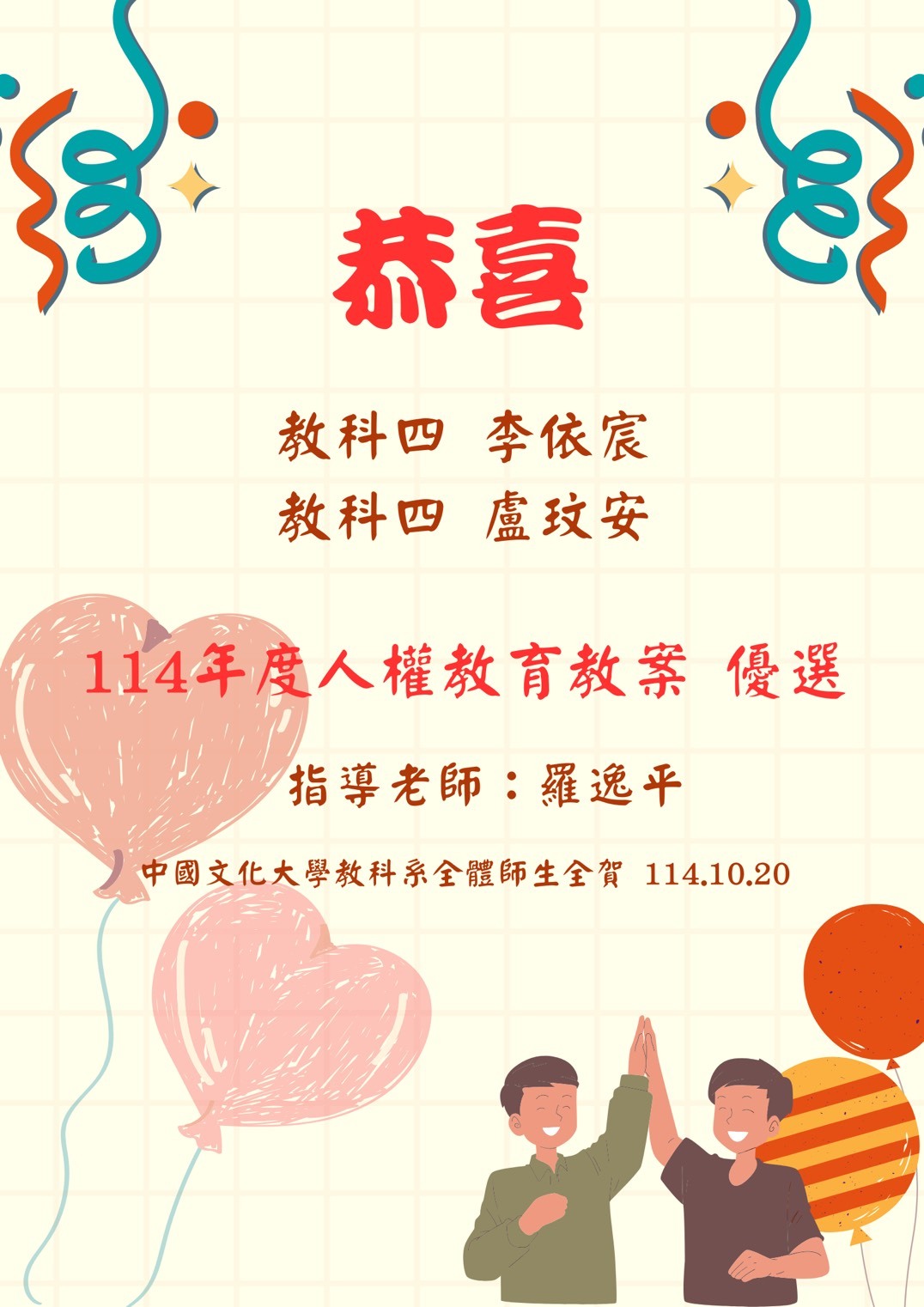 恭喜本系教科四李依宸、盧玟安同學,入選「114年度人權教育教案」優選!